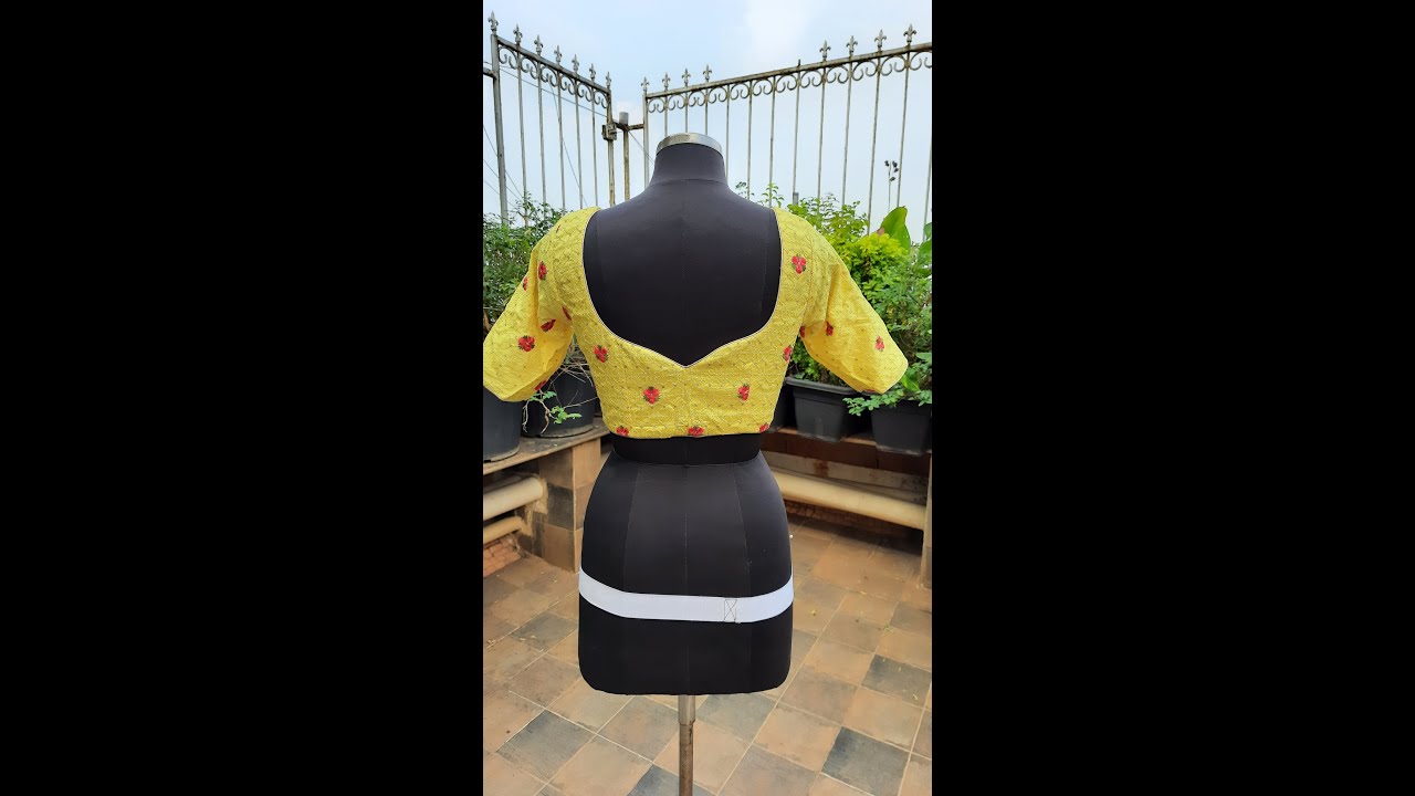 It is padded and has hook-eyes in front. It is lined with butter crepe lining and has a good amount of margin on both sides. The sleeve length is elbow length, which is trending at the moment. The neck and sleeve edges are embellished with soft gold piping, giving it even more definition.