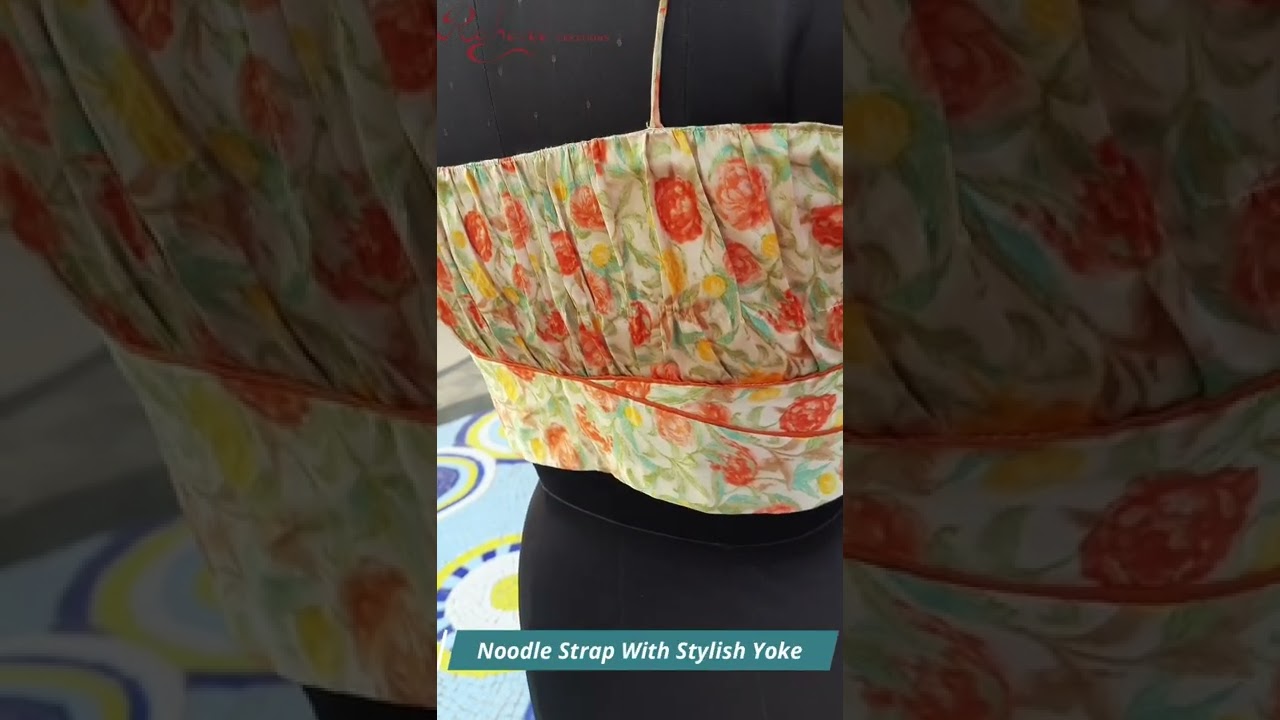 This is a beautiful, sexy, noodle-strap designer blouse made of high-quality soft printed satin silk fabric. It has a super stylish gathered look near the bust both in front and back and a plain yoke below the bust. It looks trendy and gives an excellent fit. If you are looking for something stylish and bold with a good fit, then this is for you. It can be worn with a plain saree of any complementing or contrasting color. Also, you can pair it with a printed saree in complementary colors.