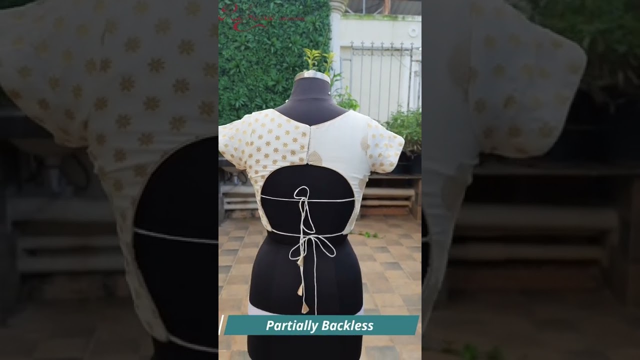 This is a beautiful, sensuous designer blouse is made of high-quality pearl white brocade fabric with light gold motifs in two designs. It is in a princess-line cut with a small round neck and keyhole and has a sexy back with hook-eyes on top and two tie-ups/doris near the waist. This semi-backless back adds that oomph and boldness to it.