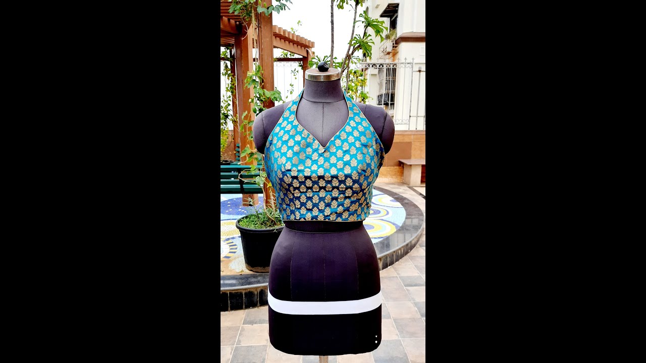This is a beautiful, sensuous, designer blouse made of high-quality brocade silk fabric with a halter neck. This is lined with butter crepe fabric. The neck and armhole, all the way to the back, are bordered with gold piping.