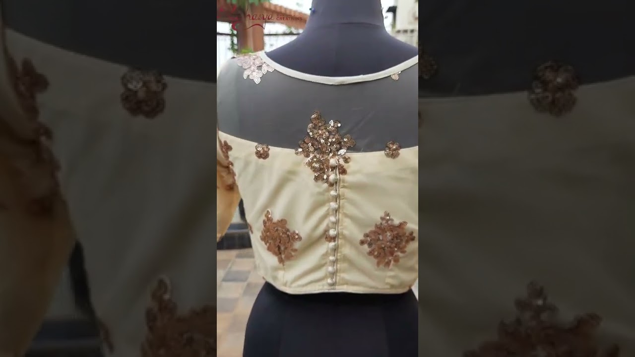 This is a beautiful, sensuous, designer blouse made of high-quality net with sequin fabric with a boat neck. This top part, in the back, is see through and the botton part has show potli buttons. The blouse is lined with butter crepe fabric and is padded.