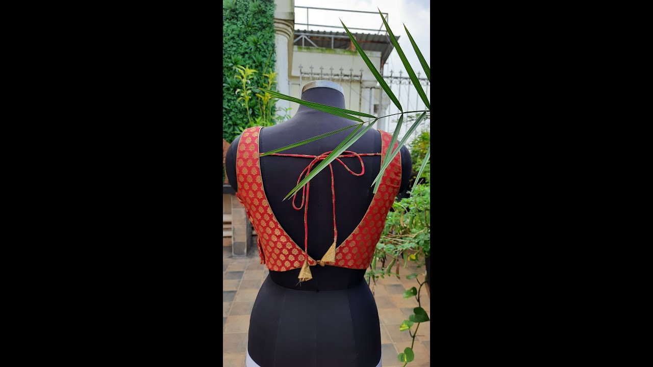 This is a beautiful, sensuous designer blouse is made of high-quality brocade fabric with light gold motifs. It is in a princess-line cut with a rounded V-neck in front and a sexy deep rounded V-neck behind. It is secured with a button near the waist and a tie-up/dori at the back. This semi-backless back adds that oomph and boldness to it.
