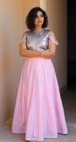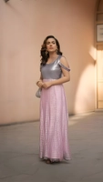 Step into effortless elegance with this stunning party wear designer outfit. Crafted from premium handpicked tissue silk with subtle grey lines, it radiates sophistication. The graceful flare is adorned with delicate scallop embroidery at the hem, while the yoke features luxurious sequin fabric for a touch of glamour.